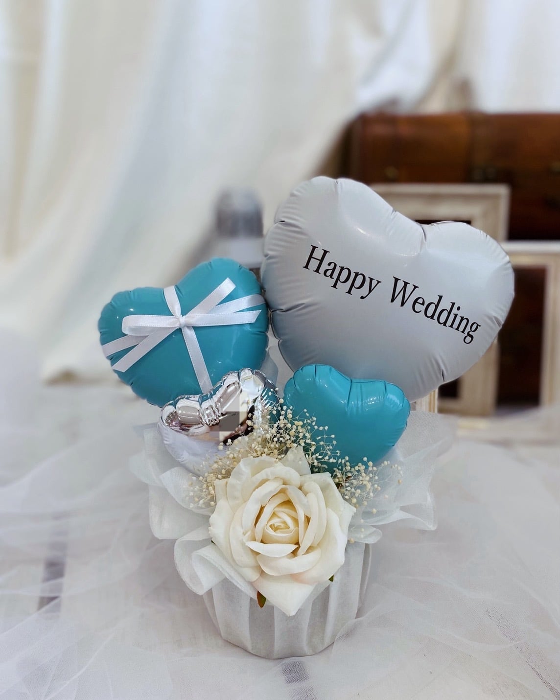 人気のティファニーカラーを基調にした、愛らしくもエレガントなウェディングアレンジです。結婚式の特別な日を彩るためにデザインされており、花の美しさが際立ちます。